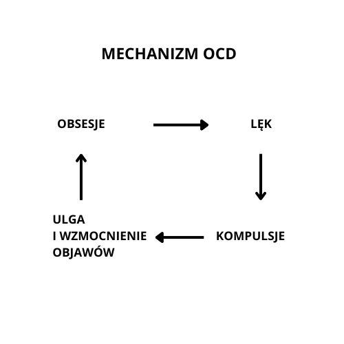 - z towarzyszącym myśleniem magicznym (np. przekonanie, że matka ulegnie wypadkowi, jeśli rzeczy nie będą na właściwym miejscu)